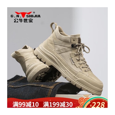 公牛世家【头层猪皮】男鞋工装鞋子男新款加绒保暖马丁靴男百搭男靴登山靴 杏色 44(标准运动尺码)